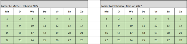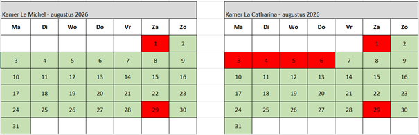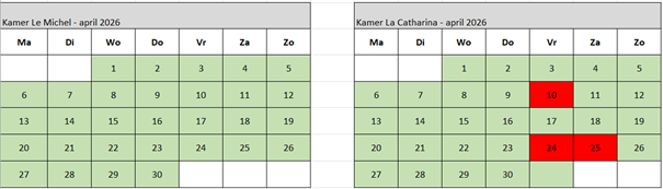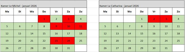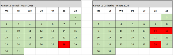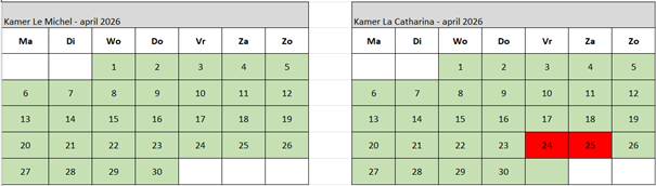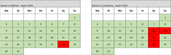 (wit = gesloten (vraag naar mogelijkheden) groen = vrij rood = gereserveerd)
